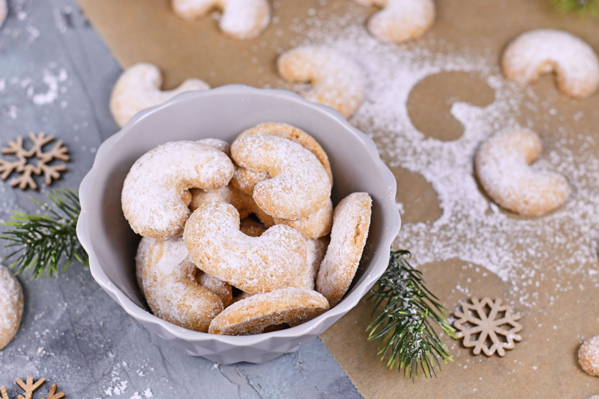 La ricetta dei Vanillekipferl si distingue per la sua semplicità: basta unire farina, burro, zucchero a velo e mandorle tritate per ottenere un impasto morbido e gustoso. Modellandoli a forma di mezzaluna e spolverizzandoli ancora caldi con zucchero vanigliato, i biscotti acquisiscono la loro caratteristica più distintiva: un delicato sapore di vaniglia e un aspetto innevato. Ideali da preparare in occasione di riunioni familiari e perfetti da regalare in scatole decorative.