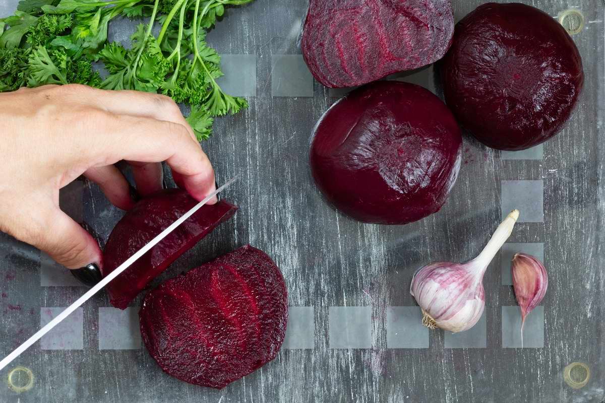 Tagliare solo le estremità indurite, lasciando circa 2 cm. L’estremità funge da tappo che impedisce la fuoriuscita del succo durante la cottura, anche al vapore. Prima di mettere le barbabietole, forare ogni pezzo con una forchetta. In questo modo il vapore raggiungerà più rapidamente l’interno. Dopo la cottura e il raffreddamento con acqua fredda, la buccia si staccherà senza problemi.